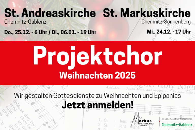 Wir gestalten die musikalische Christvesper am 24.12., um 17 Uhr in der Markuskirche (Musikalische Leitung: S. Beyer) und umrahmen und ergänzen das Krippenspiel der Jungen Gemeinde am 1. Weihnachtsfeiertag, 25.12., um 6 Uhr und am 06.01.2026 um 19 Uhr in der St. Andreaskirche(Musikalische Leitung: Kantor Stadler).