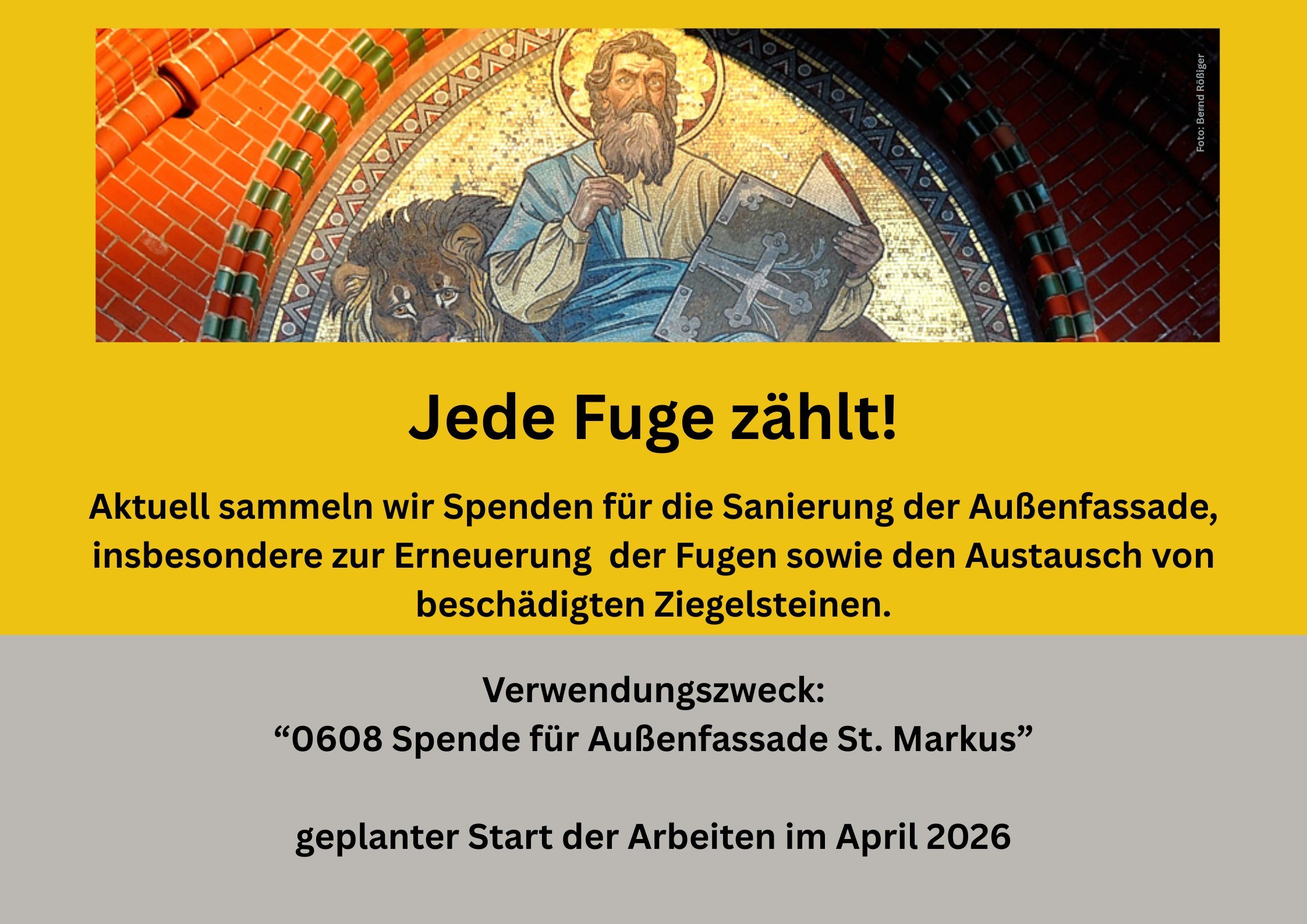 - Spende zur Sanierung der Außenfassade: 0608 Spende für Außenfassade St. Markus